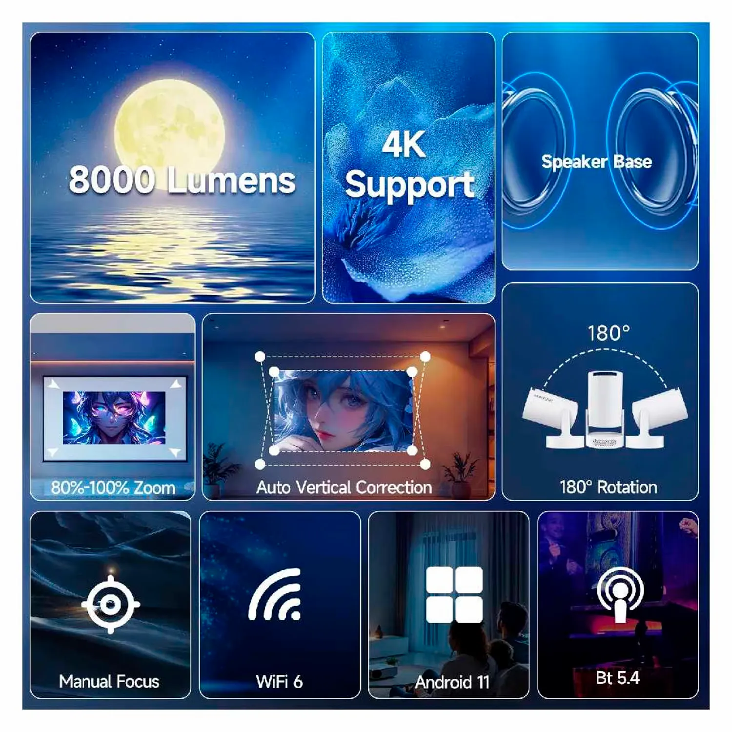 Proyector Magcubic 4K HY300 Pro+ con altavoz integrado de 5 W, 1280 x 720P, Android 14, 8000 lúmenes, Wifi6, BT5.4, portátil para exteriores